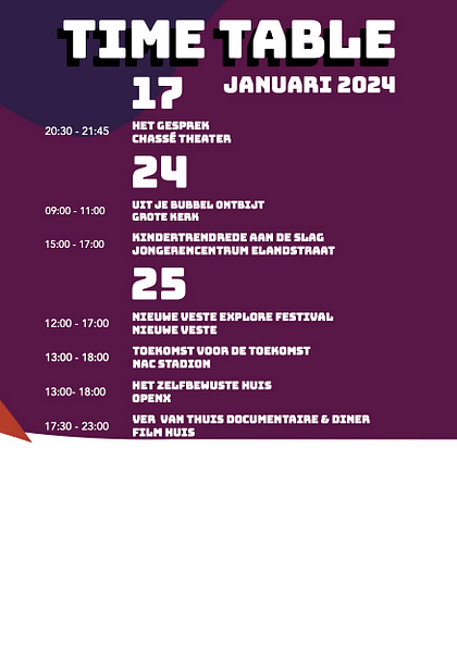 Verassende kunst, werelds eten en boeiende gesprekken, dat is waar Explore om draait. Werk van St. Joost studenten, van oa. de minor Arts & Humanity, is te zien tijdens het festival wat plaatsvindt op 17, 24 en 25 januari in Breda. Ze zijn met name te zien tijdens het werelds ontbijt met kunst, hiphop, poëzie en inspirerende talks in de Grote Kerk. En ook met een flink aantal performances on ontmoetingsplek de Nieuwe Veste. Komt dat zien!